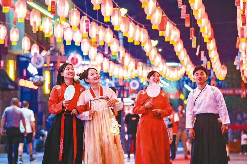 中秋佳节和国庆长假期间,游客在成都宽窄巷子,沉浸式感受唐宋时代的市井文化生活。 新华社记者 江宏景 摄