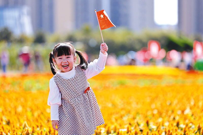 10月1日,小朋友在山东省枣庄市一处花海景点游玩。新华社发