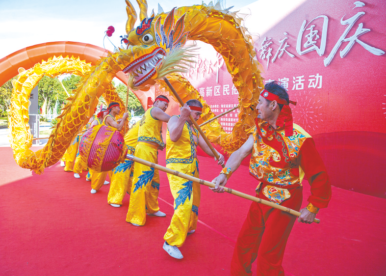 10月1日,江苏海安高新区一广场上,文化志愿者在表演龙舞。新华社发