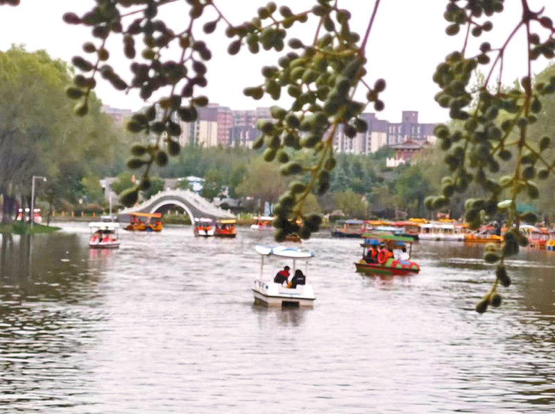 10月5日,市置地公园游客在置地湖划船游玩。
