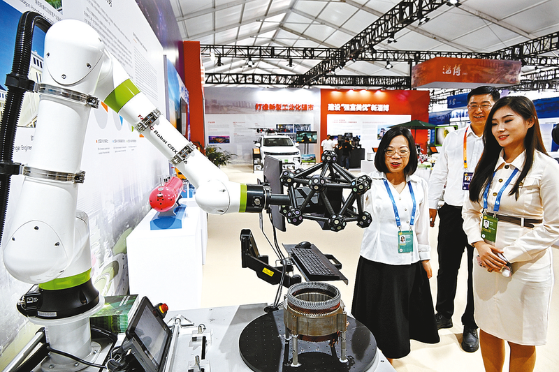 10月10日,观众在山东青岛参观“2023跨国公司与中国主题展”。当日,由商务部和山东省共同举办的第四届跨国公司领导人青岛峰会启幕。