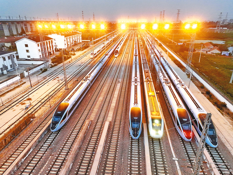 10月10日,动车组列车停在江苏省连云港市境内存车场等待发车(无人机照片)。10月11日零时起,全国铁路将实行第四季度列车运行图。新华社发