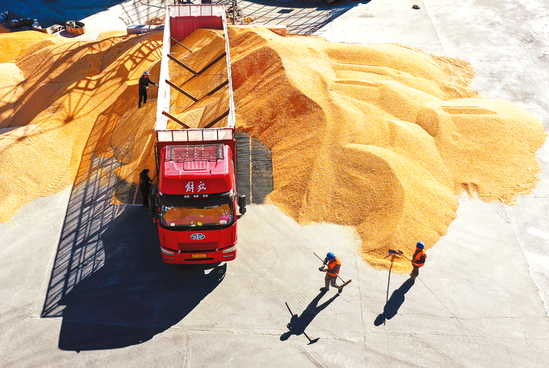 10月15日,司机驾驶运粮车在通辽市科尔沁左翼中旗腰林毛都镇收粮站卸粮(无人机照片)。