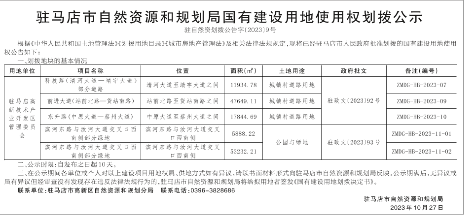 驻马店市自然资源和规划局国有建设用地使用权划拨公示