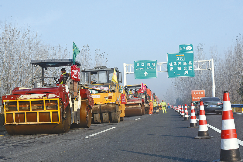 10月27日上午,在大广高速公路平舆至正阳岳城段(简称“平正高速”)集中养护工程施工现场,记者看到这样一幕:加热机、翻松机、补热机、复拌机、摊铺机、压路机等13台大型养护设备在施工路面排列成串,像一组缓缓移动的列车,这组“养护专列”所过之处,“吃”进旧路,“吐”出新路,旧路瞬间换新颜。