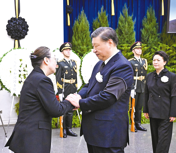 上午9时许,习近平和夫人彭丽媛,李强、赵乐际、王沪宁、蔡奇、丁薛祥、李希、韩正等,在哀乐声中缓步来到李克强同志的遗体前肃立默哀,向李克强同志的遗体三鞠躬,并与李克强同志亲属一一握手,表示慰问。胡锦涛送花圈,对李克强同志逝世表示哀悼。