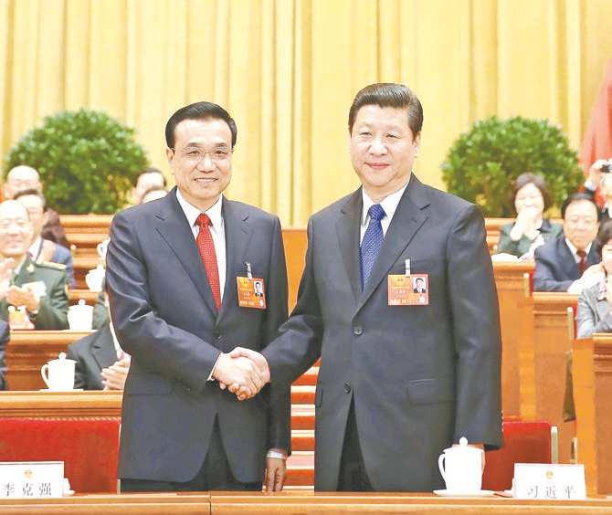 2013年3月15日,第十二届全国人民代表大会第一次会议在北京人民大会堂举行第五次全体会议。会议经过投票表决,决定李克强为中华人民共和国国务院总理。这是习近平同志和李克强同志亲切握手。新华社记者 兰红光 摄