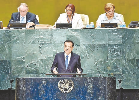 2016年9月21日,李克强同志在纽约联合国总部出席第71届联合国大会以“可持续发展目标:共同努力改造我们的世界”为主题的一般性辩论并发表题为《携手建设和平稳定可持续发展的世界》的讲话。 新华社记者 李 涛 摄