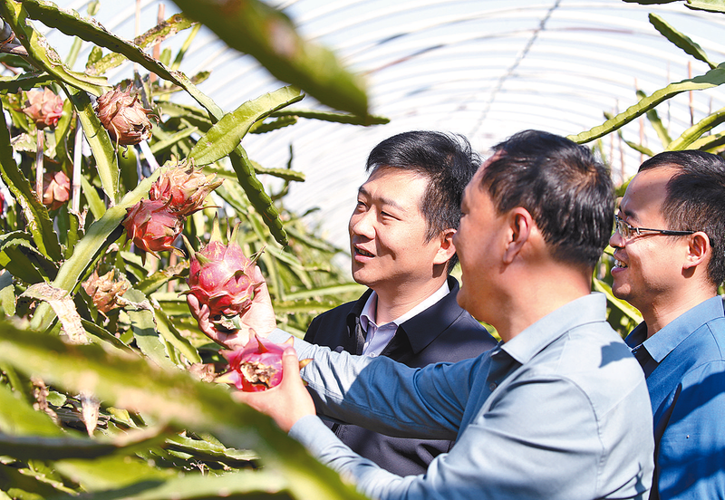 市纪委监委驻小方村第一书记李杨与种植户一起查看火龙果挂果情况。 本报记者 弓华静 摄 深秋时节,走进汝南县老君庙镇小方村,只见一座座蔬菜大棚错落有致、蔚为壮观。
