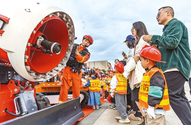 11月8日,在浙江省温州市世纪广场消防宣传月活动现场,消防员向市民展示消防救援器材。11月9日是第32个全国消防日,今年的活动主题为“预防为主,生命至上”。