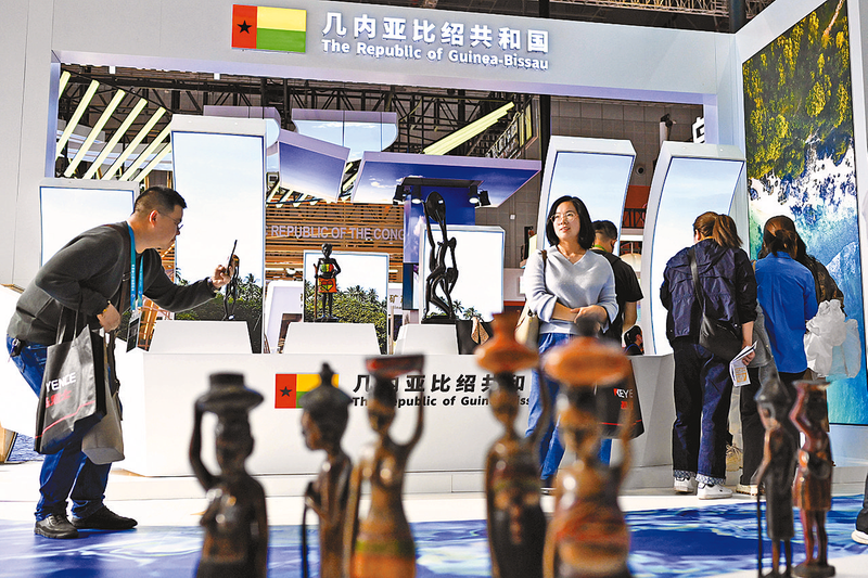 11月8日,观众在第六届进博会几内亚比绍共和国展台拍照。第六届进博会为来自30个最不发达国家的约100家企业提供免费展位、搭建补贴等措施,持续推动这些国家的特色产品进入中国市场。 新华社记者 张可任 摄