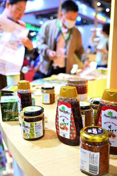 11月8日,在第六届进博会上,观众了解刚果民主共和国蜂蜜产品。 新华社记者 张可任 摄 “从法国农场到中国餐桌”——第六届进博会开幕第二天,食品及农产品展区的一个角落,40多家法国农食企业集体亮相,与国内采购商面对面交流对接。