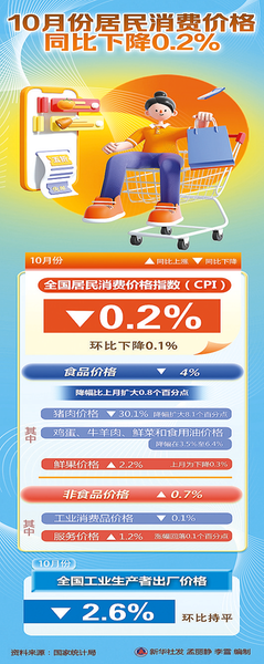 国家统计局9日发布数据,10月份,全国居民消费价格指数(CPI)同比下降0.2%。