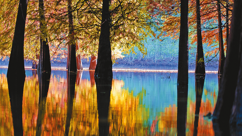 近日,位于确山县土门林场的水杉林在阳光下耀眼夺目、明媚动人,吸引众多游客观赏打卡。水杉林与水中的倒影相映成趣,宛如人间仙境一般,令人惊叹不已。