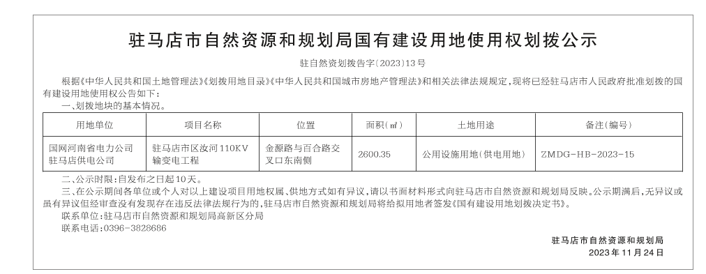 驻马店市自然资源局和规划局国有建设使用权划拨公示