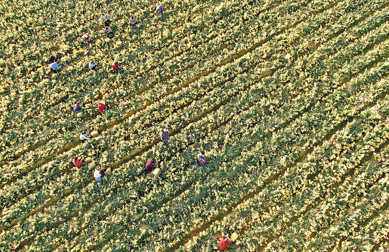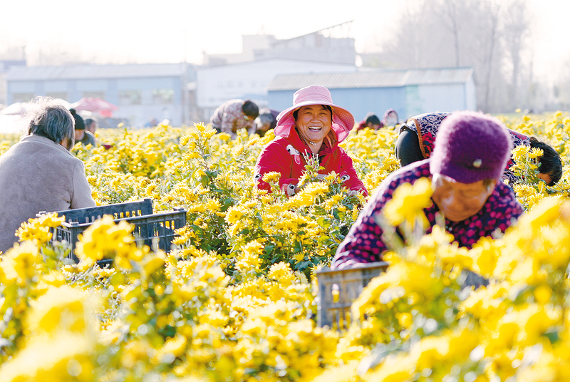 近日,新蔡县关津乡王楼村的数百亩金丝皇菊迎来丰收季。走进遍地金黄的金丝皇菊种植基地,菊花香气四溢,数十名村民趁着晴好天气忙着采摘,一派繁忙景象。