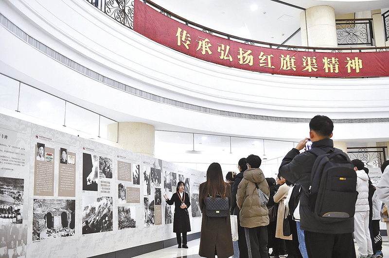 11月28日,河南农业大学的学生在参观红旗渠精神主题展览。当日,“红旗渠精神进校园巡展”活动走进位于郑州的河南农业大学,通过红旗渠精神主题展览和红旗渠精神主题宣讲活动,为师生们带来一堂生动的思政课。新华社记者 鲁 鹏 摄