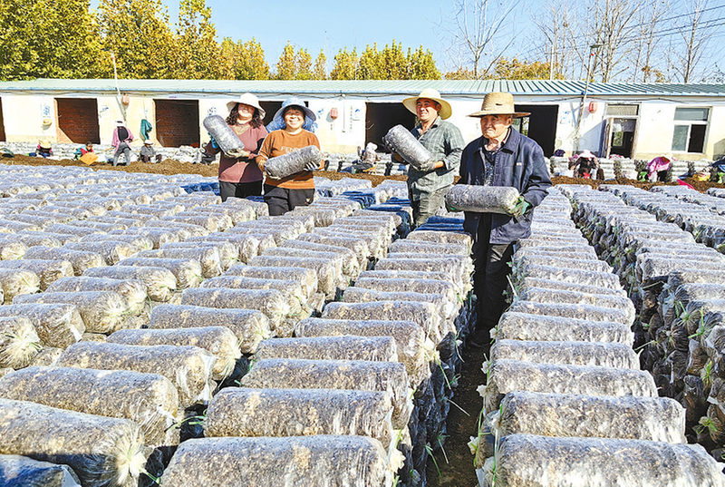 近日,在正阳县熊寨镇毛集村长丰食用菌农民专业种植合作社,20多名菇农忙着将菌种装袋。