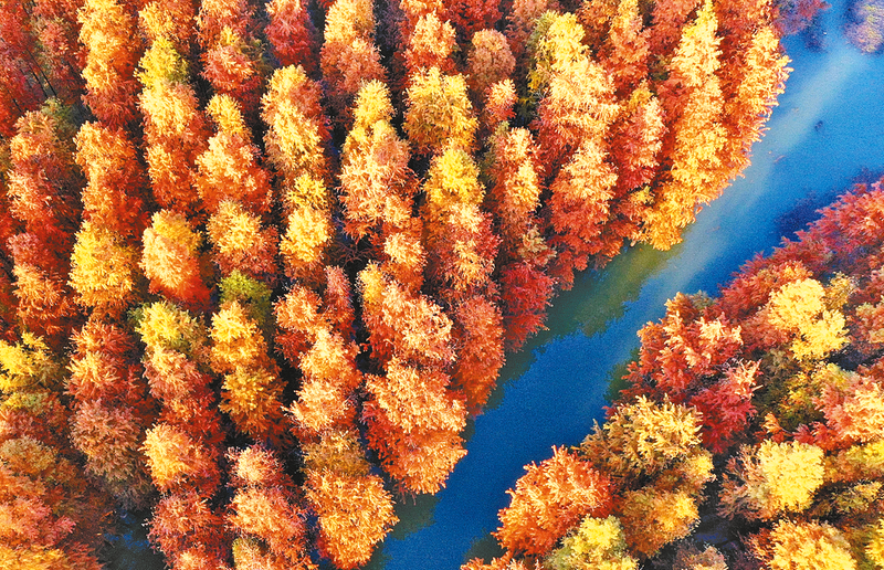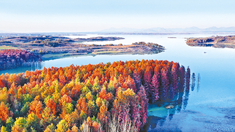 位于泌阳县付庄乡的李朝京村,离市区50多公里,是白云山下、板桥水库旁的一个小山村。随着冬季的到来,12月7日,记者在这里看到,村边一大片池杉林逐步褪去翠绿的外套,染上一身色彩斑斓的外衣,湖面波光潋滟,白鹭在林间嬉戏觅食,与周边湖光山色融为一体,构成一幅人与自然和谐共生的美丽画卷。