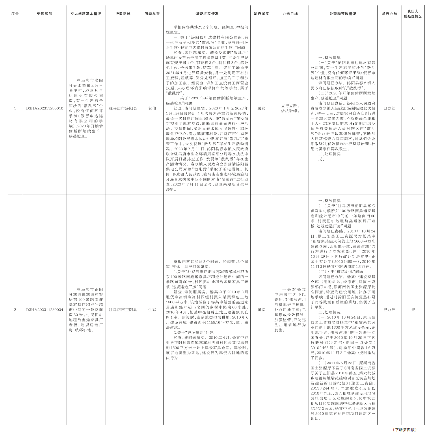 11月29日,中央第二生态环境保护督察组向我市交办第七批4个群众举报件,截至12月8日,已办结2件,阶段性办结2件,查处和整改情况已按要求进行公开,具体内容请查阅驻马店市人民政府网站