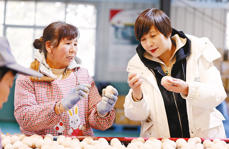 在传送带前,海蓝牧业有限责任公司负责人代红艳与工作人员一起查看鸡蛋的品质。本报记者 弓华静 摄