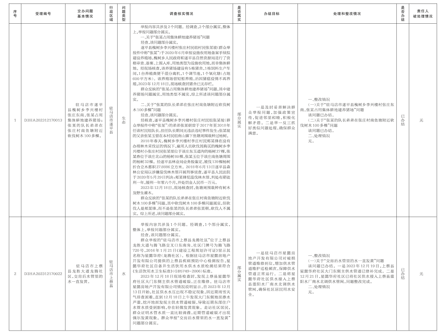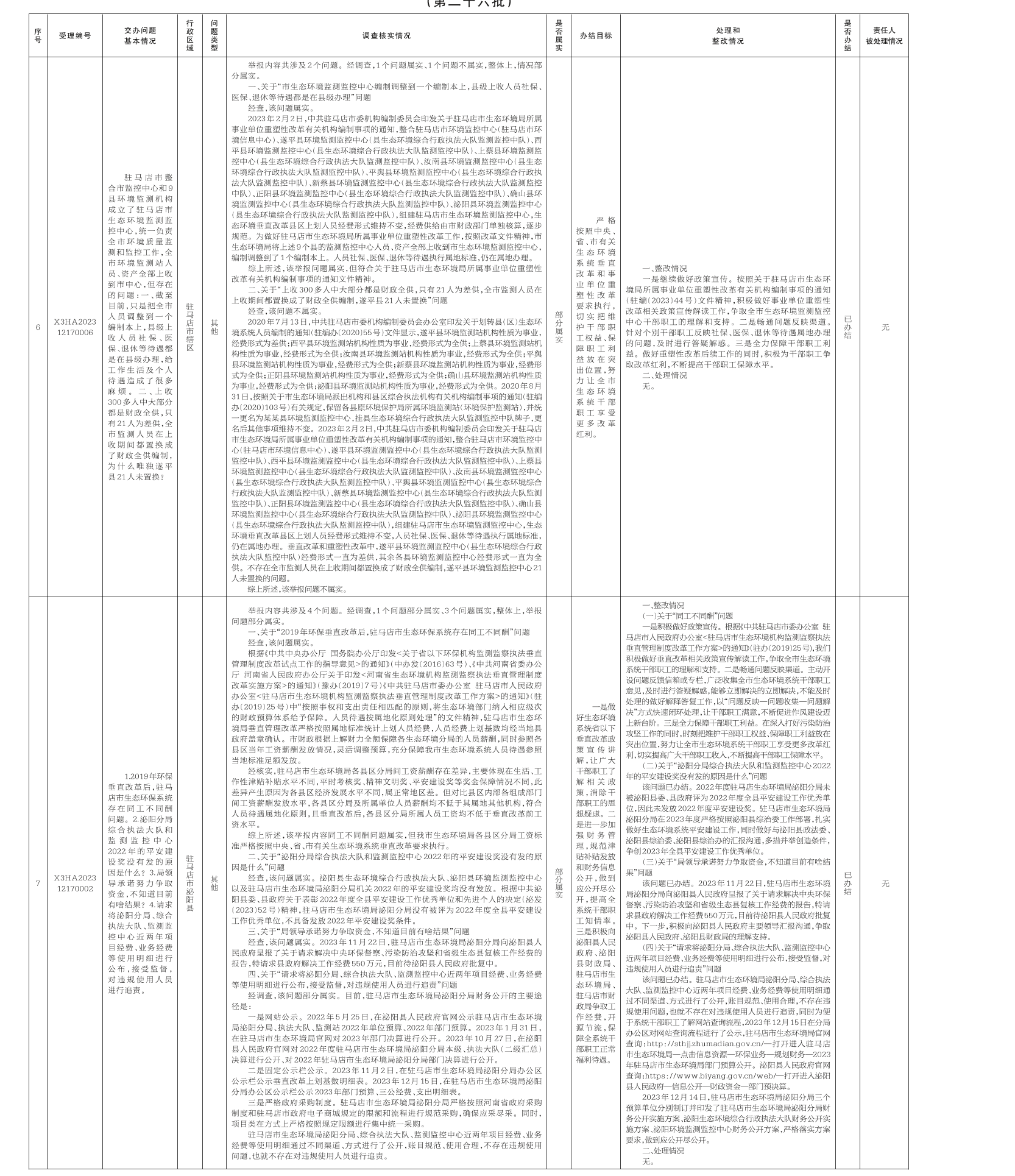 12月18日,中央第二生态环境保护督察组向我市交办第二十六批7个群众举报件,截至12月28日,已办结6件,阶段性办结1件,查处和整改情况已按要求进行公开,具体内容请查阅驻马店市人民政府网站