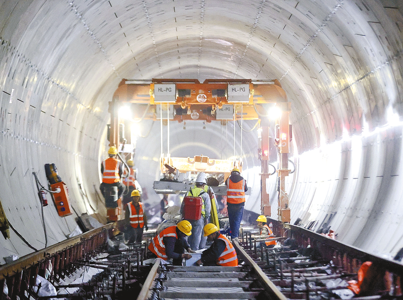 元旦假期期间,各行各业的劳动者坚守岗位,在一线忙碌。 2023年12月31日,在浙江省湖州市德清县杭德市域铁路项目工地,中铁一局工人在铺轨作业中。