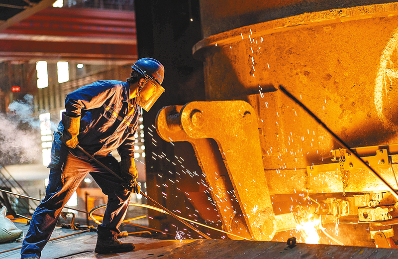 2023年12月31日,在位于安徽省马鞍山市的中国宝武马钢股份特钢公司,工人在生产线上忙碌。 新华社发