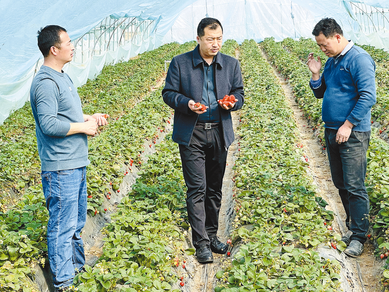 近日,河南省社会保险中心派驻新蔡县栎城乡张庙村驻村第一书记殷松与张庙草莓种植园负责人陈文兵在大棚内交流致富经验。