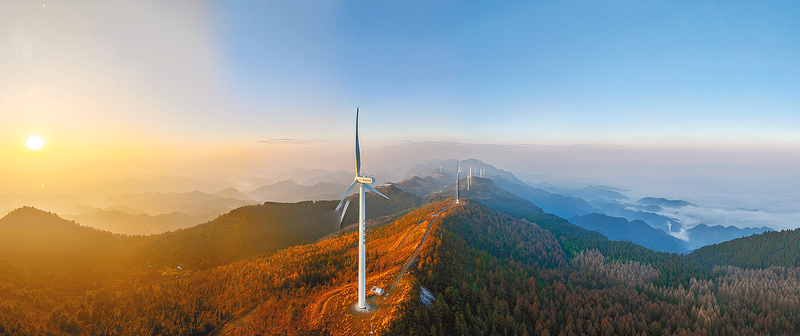 这是1月10日在千野草场景区拍摄的风力发电机组(无人机全景照片)。千野草场景区位于重庆市石柱土家族自治县,是黄水国家森林公园的一个重点景区。景区资源丰富,集山、林、草、石于一体。冬日的早晨,千野草场景区云雾缭绕,景色迷人。 新华社记者 黄 伟 摄