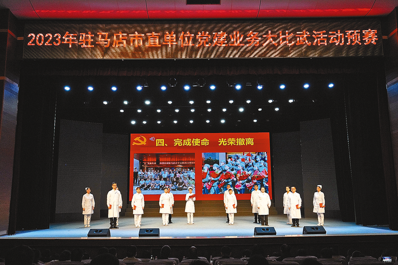 汇报展演精彩纷呈。 1月19日,驻马店市直单位党建业务大比武汇报展演在市群星剧场精彩呈现。市委办公室、驻马店第二实验小学等12个参赛单位用专业的党建能力、规范的流程展示、精彩的现场演绎向大家奉献了一场场视觉盛宴。省委直属机关工委领导、市领导现场观看指导,平顶山、信阳等兄弟地市市委直属机关工委有关同志现场观摩,市直、中央和省驻驻单位党务干部260多人现场观看。此次汇报展演由河南广播电视台全程直播,全省、市和各县区共18.46万人次线上观看。汇报展演获得了省直单位、兄弟地市和社会各界的广泛关注与一致好评,达到了锻炼队伍、规范工作、提供样板、树立形象、宣传工作的目的,产生了积极而广泛的影响,取得了圆满成功。至此,持续两个多月的驻马店市直单位党建业务大比武活动完美落幕。