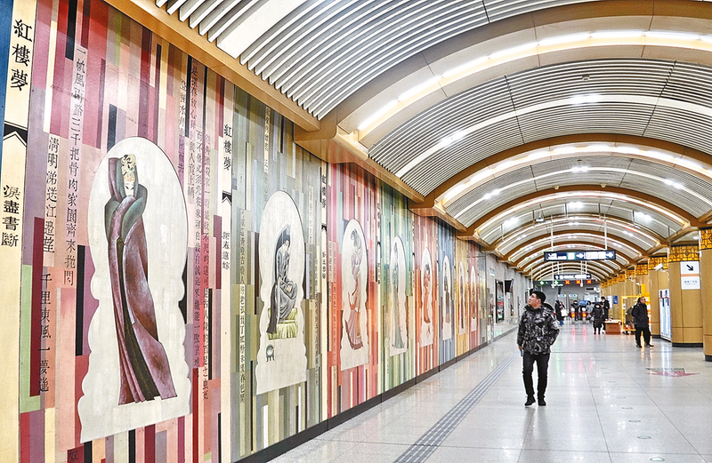 乘客在磁器口地铁站内观看“红楼梦”壁画(1月20日摄)。近年来,北京市在大力建设地下轨道交通的同时,注重站点的艺术设计,给乘客带来艺术享受。