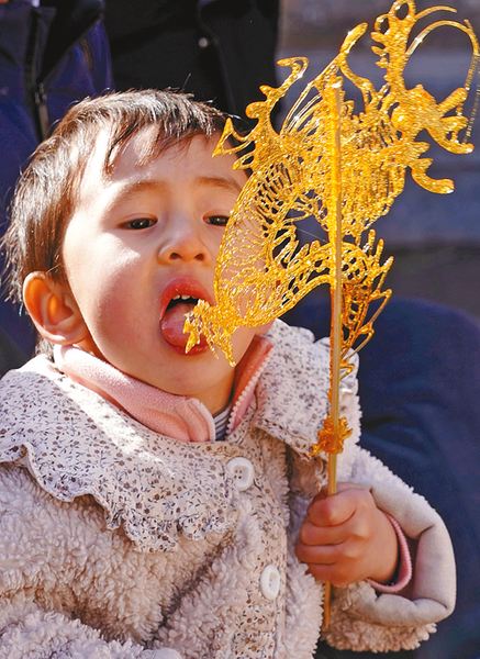 2月16日,小朋友在位于郑州市中牟县的电影小镇品尝糖画。 新华社记者 李 安 摄
