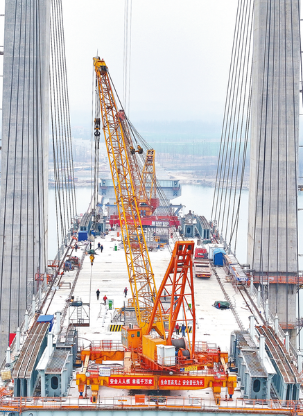 2月18日,在湖北襄阳牛首汉江特大桥施工现场,施工人员进行吊装作业。