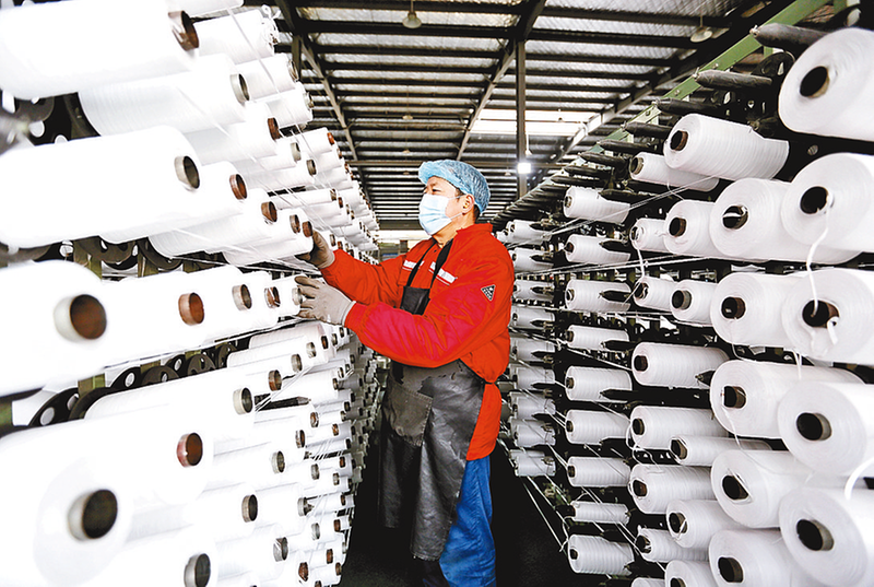 2月18日,工人在江苏省连云港市连云区一家纺织企业忙碌。
