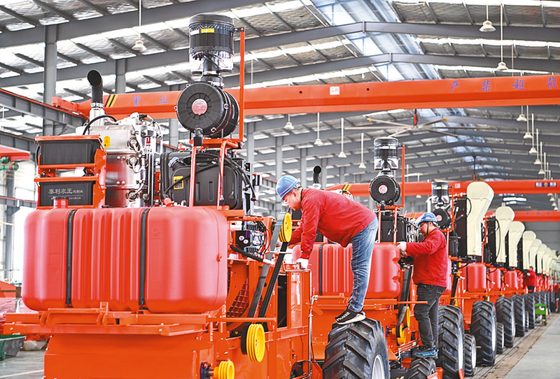 2月18日,在河南省沁阳市经济开发区一家机械制造企业的车间,工人在组装联合收割机。
