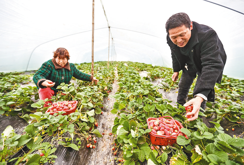 近日,在正阳县兰青镇潘庄村罗氏种植专业合作社罗文武草莓大棚内,罗文武和妻子正在采摘草莓。今年,罗文武种了4棚草莓,由于品质好,深受消费者青睐。