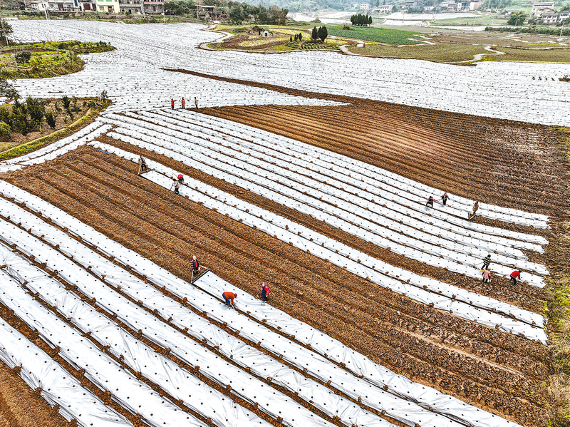 3月5日,在重庆市梁平区金带街道石燕村蔬菜种植基地,农民在田地里劳作(无人机照片)。当日是惊蛰节气,各地抢抓时节进行春季田间管理,田间地头一派农忙景象。 新华社记者 唐 奕 摄