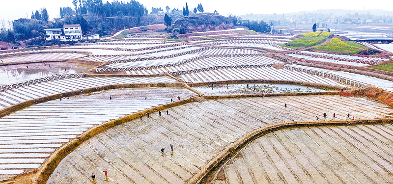 时下正值春耕备耕时节,各地抢抓农时,积极开展早稻育秧、农田翻耕、农机检修等工作,为春耕生产打下基础。3月6日,在四川省广安市前锋区观塘镇仁和村,农民在高标准农田育秧(无人机照片)。