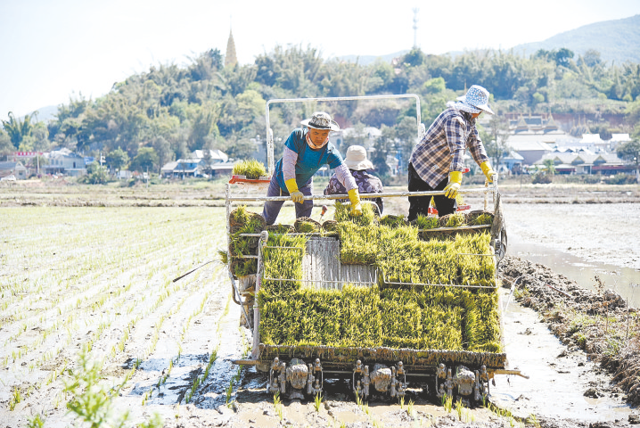 3月6日,云南省西双版纳州勐海县勐遮镇曼恩村的农民驾驶插秧机进行插秧作业。 新华社发