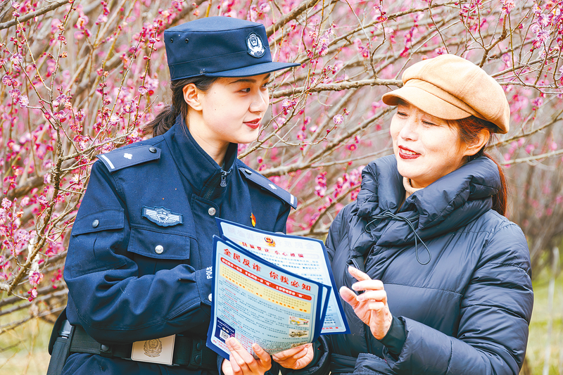 近日,开发区公安分局民警在网红打卡地向正在赏花的市民,发放反诈宣传单,普及反诈知识,提醒市民对虚假可疑信息时刻保持警惕,做到不轻信、不扫码、不转账。