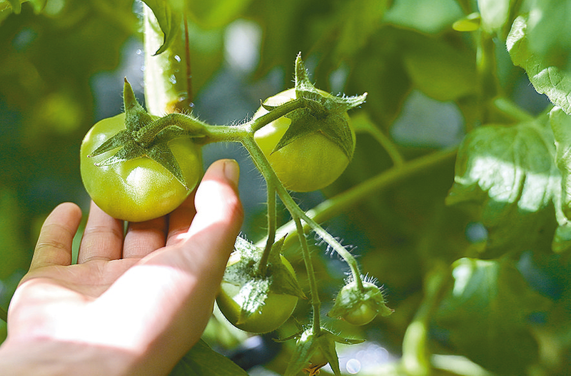在新疆阿克苏市阿依库勒镇蔬菜基地,种植户查看西红柿的生长情况(3月24日摄)。