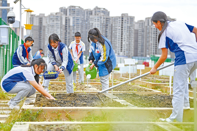 3月25日,在成都市中和中学楼顶农田,中学生开展春季农作物播种劳动实践。成都市中和中学在教学楼楼顶建有一片“空中农田”,各班级负责管理“责任田”。学生在老师的指导下参与种植玉米、茄子等农作物,学习农作物种植知识。