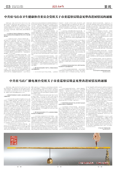 中共驻马店市卫生健康体育委员会党组关于市委巡察反馈意见整改进展情况的通报