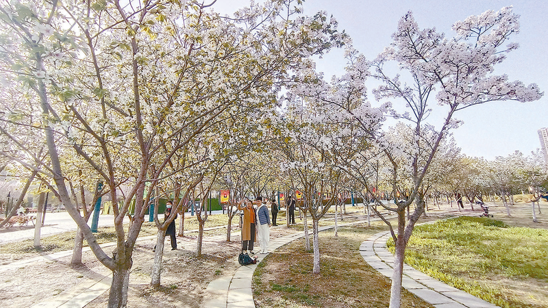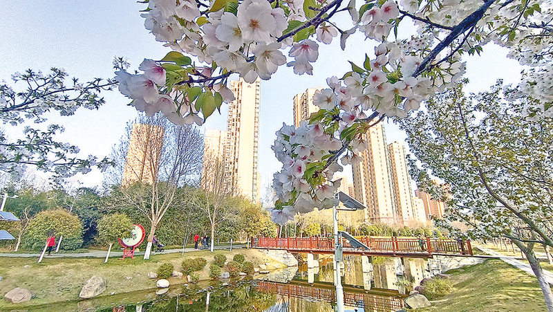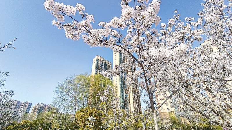 3月30日,记者在开源公园看到,山樱花竞相绽放,满树的樱花白清如雪、红粉诱人,游客徜徉在花海中感受阵阵扑鼻的花香,心旷神怡。