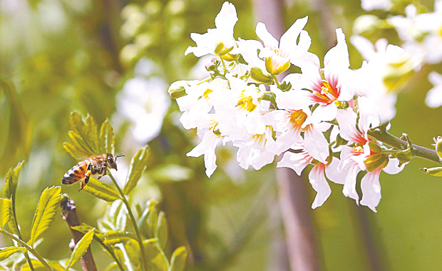 繁花似锦、春意盎然。4月8日,在驿城区中药材种植基地,去年种植的文冠果树首次迎来盛花期,吸引游客前来赏花游玩。