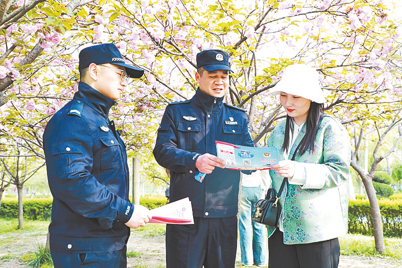 近日,汝南县天中山文化园牡丹盛开,该县公安局民警在执勤过程中为游客提供道路指引、赏花攻略等服务,并积极宣传反诈知识,提醒游客在游玩时谨防诈骗,受到游客交口称赞。 通讯员 王航天 摄
