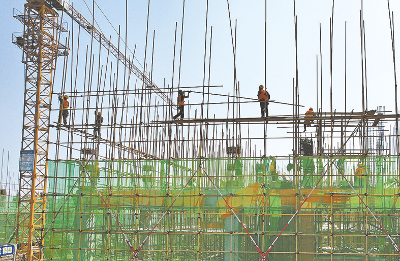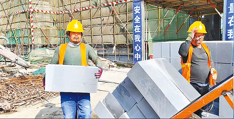 搬运混凝土砌块。 4月12日,黄淮建工的工人在“中国药谷”超级工厂项目二期工程工地上忙碌着。