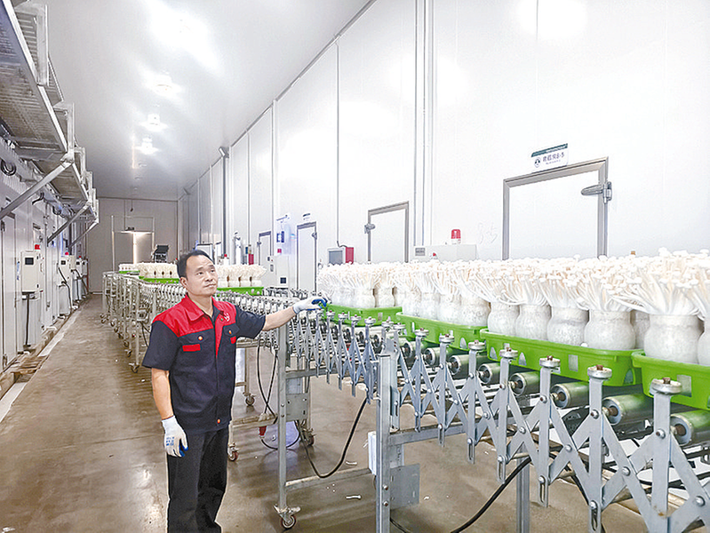 在菇养元食用菌产业园生产车间,工人在全自动化白玉菇生产流水线上工作。 本报记者 方 祥 摄