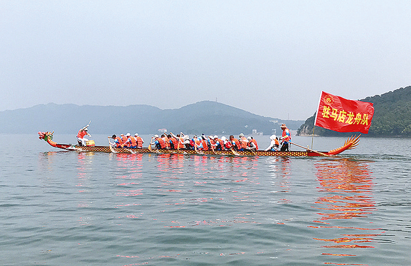 5月25日,确山县薄山湖上,一只光彩夺目的龙舟在湖面上飞驰,击鼓声呐喊声震天响,市龙舟队的队员顶着烈日积极训练,备战即将在巩义市举行的全省“洛神杯”龙舟赛。 本报记者 张 朝 摄
